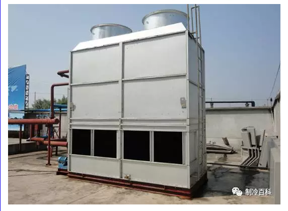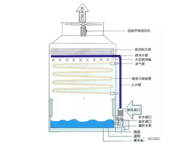 蒸發式冷凝器是利用盤管外的噴淋水部分蒸發時吸收盤管內 高溫氣態制冷劑的熱量而使管內的制冷劑逐漸由氣態被冷卻為液態。 蒸發式冷凝器是由冷卻管組、填料、淋水器、軸流風機、集水槽、水泵、收水器、箱體等部件組成。