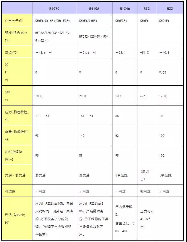 5新冷媒R407C,R410A和R22比較,有下面的注意點: