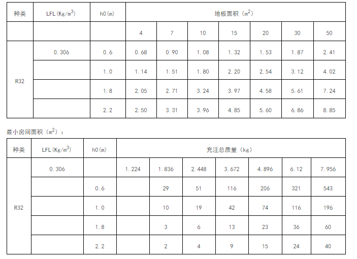1)安裝前請先閱讀說明書,根據說明書要求選擇合適安裝場所(如安裝房間面積要求,不同冷媒的使用面積詳見下表)。并對安裝場所進行安全檢查,確保沒有明火和潛在點火源(包括吸煙在內),并控制隔離可燃材料。