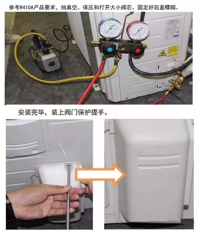 參考R410A產品要求,抽真空、保壓和打開大小閥芯、固定好后蓋螺帽。嚴禁采用機內冷媒排空!具體抽空步驟如下: