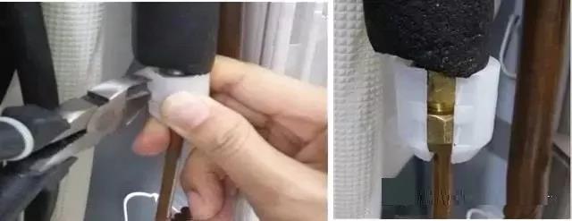 懷疑冷媒有泄漏的空調維修時,直接用六角鎖緊室外機截止閥芯,然后松開截止閥處連接管,將室內機內冷媒直接排放到大氣中,嚴禁開機收冷媒,以免壓縮機混入空氣壓縮。