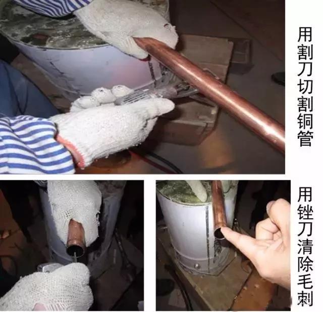 2)管道切割:銅管的切割可采用鋼鋸、砂輪機、銅管割刀,但不得采用氧--乙炔切割。銅管坡口加工采用銼刀或坡口機,但不得采用氧--乙炔焰切割加工。夾持銅管的臺虎鉗鉗口兩側應墊以木板襯墊,以防夾傷管子。