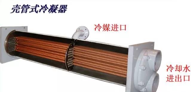 冷凝器:將制冷壓縮機排出的高溫高壓氣態制冷劑予以冷卻、使之液化,以便制冷劑在系統中循環使用 。