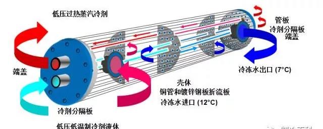 (干)式蒸發器殼管:蒸發器的制冷劑在管內流動,水在管簇外流動。制冷劑流動通常有幾個流程,由于制冷劑液體的逐漸氣化,通常越向上,其流程管數越多。為了增加水側換熱,在筒體傳熱管的外側設有若干個折流板,使水多次橫掠管簇流動。