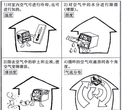 空調四要素:溫度,濕度,清潔度與氣流分布是所謂空調的四大要素,對四個要素加以調節,能夠控制室內環境以達到舒適的要求。